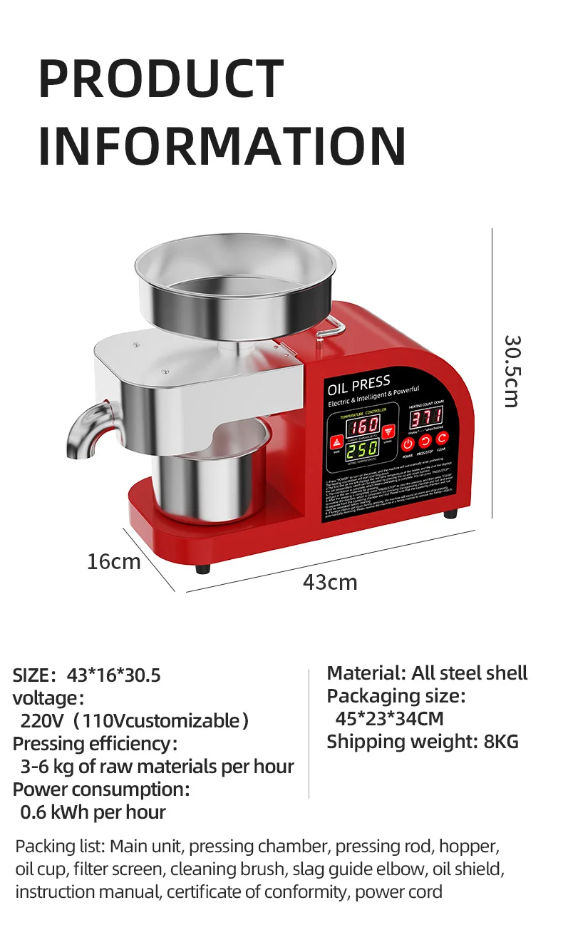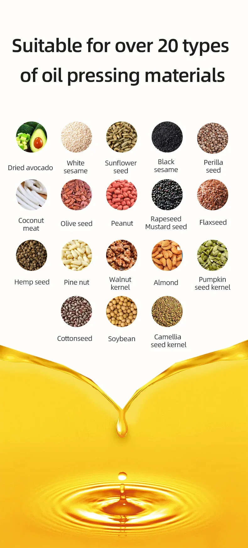 4. Under the cold-pressing mode of the material, the normal temperature of the oil coming out is around 40° C, and the nutritional components will not be lost.