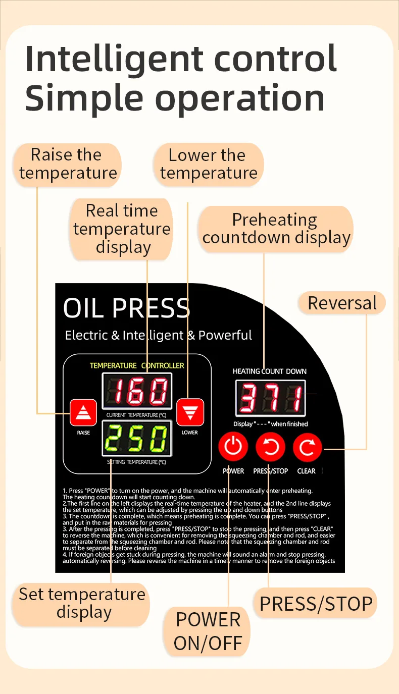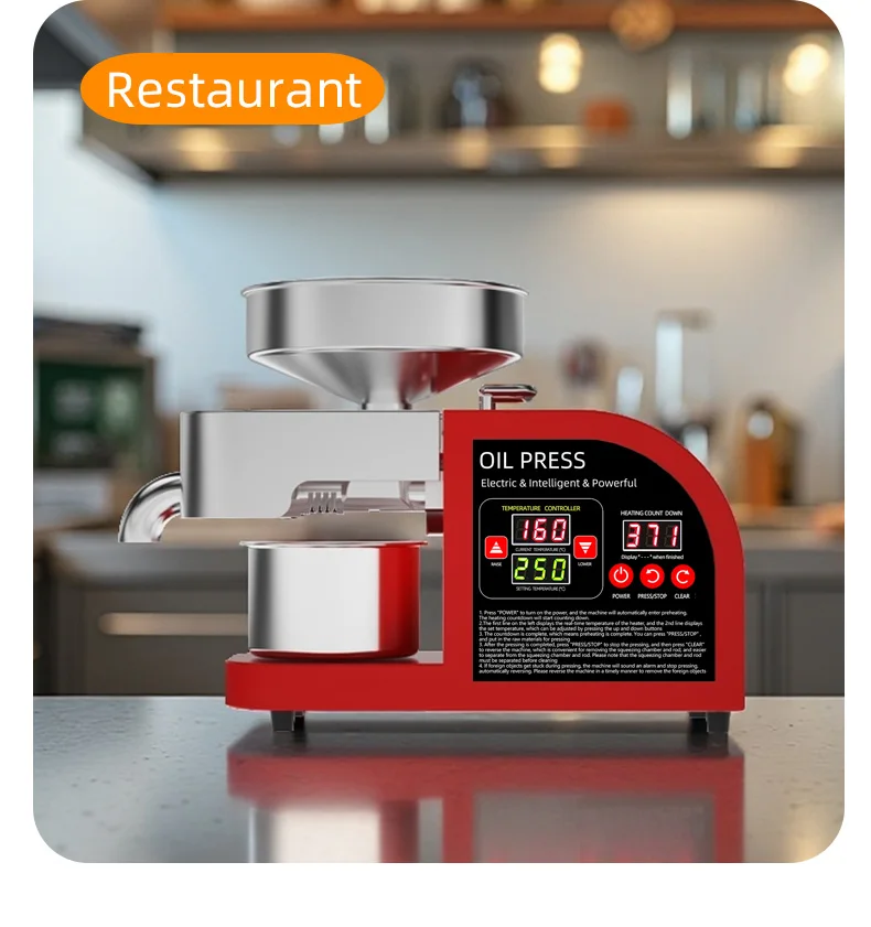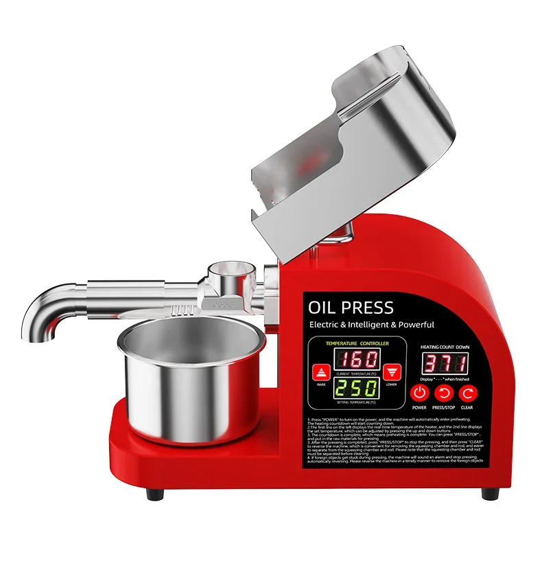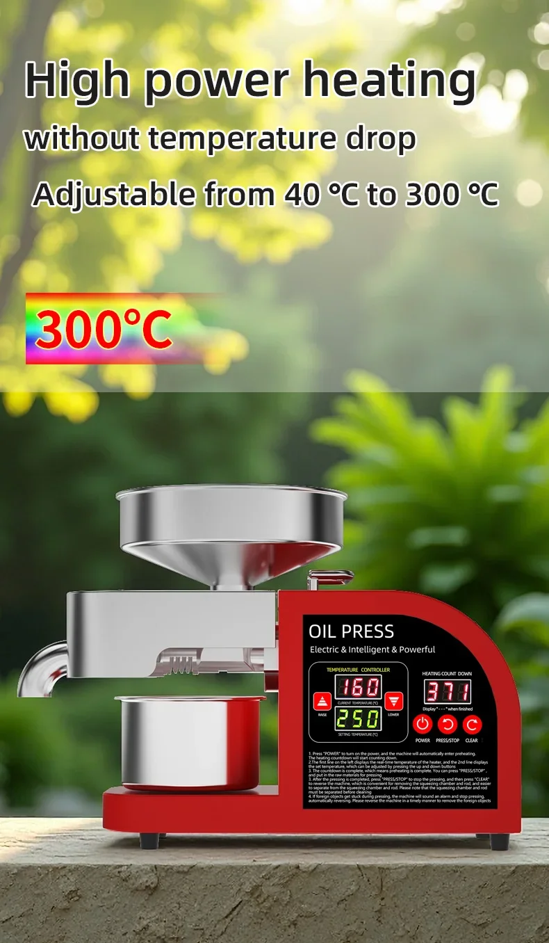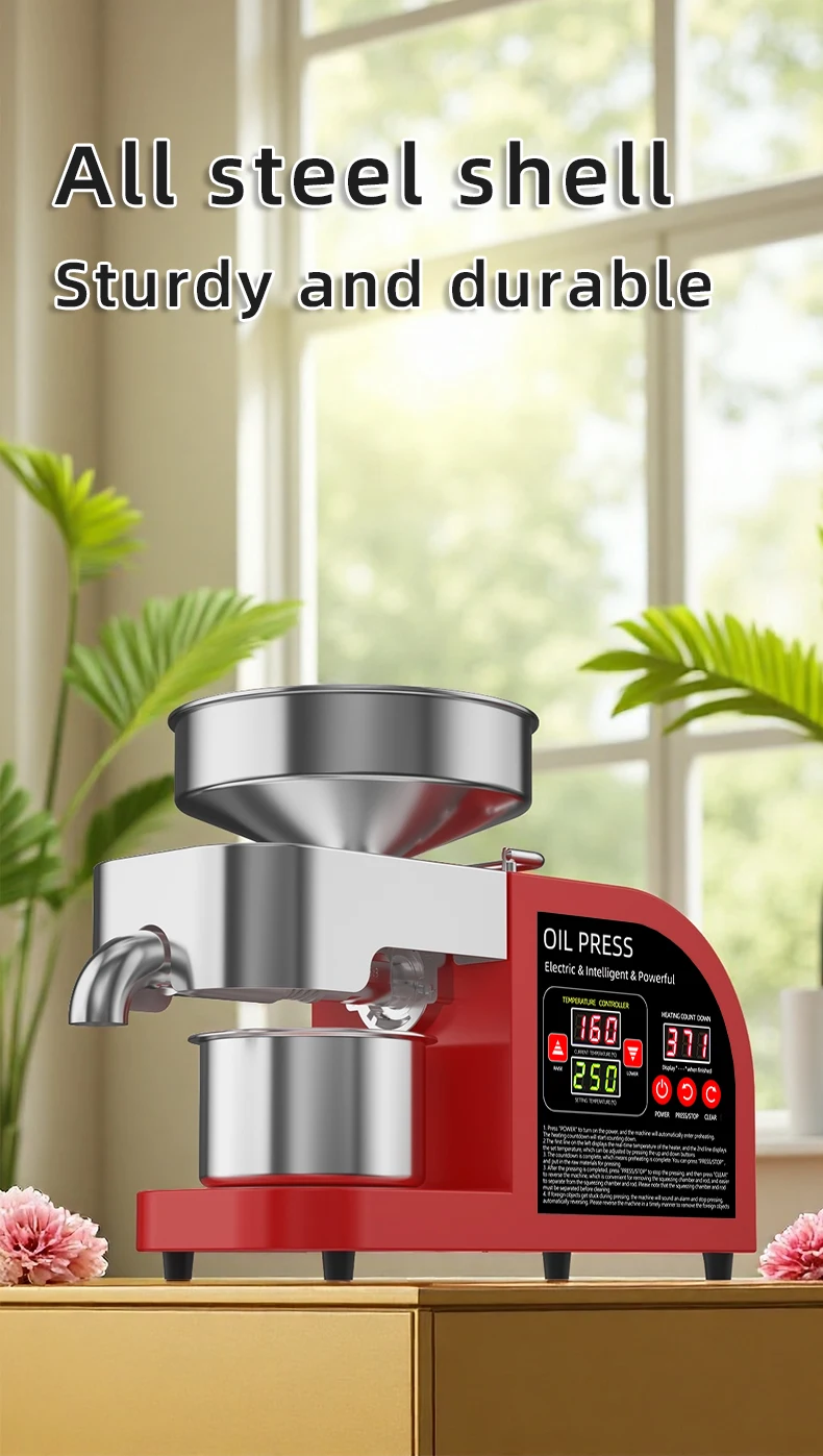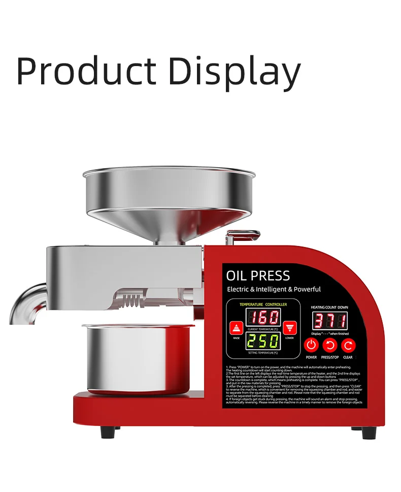 If your oil press has pressing problems, it is very likely that 90% of them are caused by temperature issues. If the pressing chamber is not preheated and the pressing is carried out directly, the raw materials will not be exposed to high temperatures in the pressing chamber and thus cannot achieve oil and residue separation. Therefore, what comes out directly is paste. All oil presses must be preheated for 8 to 10 minutes, and the S series (large commercial) machines need to be preheated for 15 minutes. If it is a 110V voltage area, the preheating time should be doubled. Moreover, the pressing chamber and pressing rod should be installed, and the front cover should be lowered to ensure that the heater is in close contact with the pressing chamber.