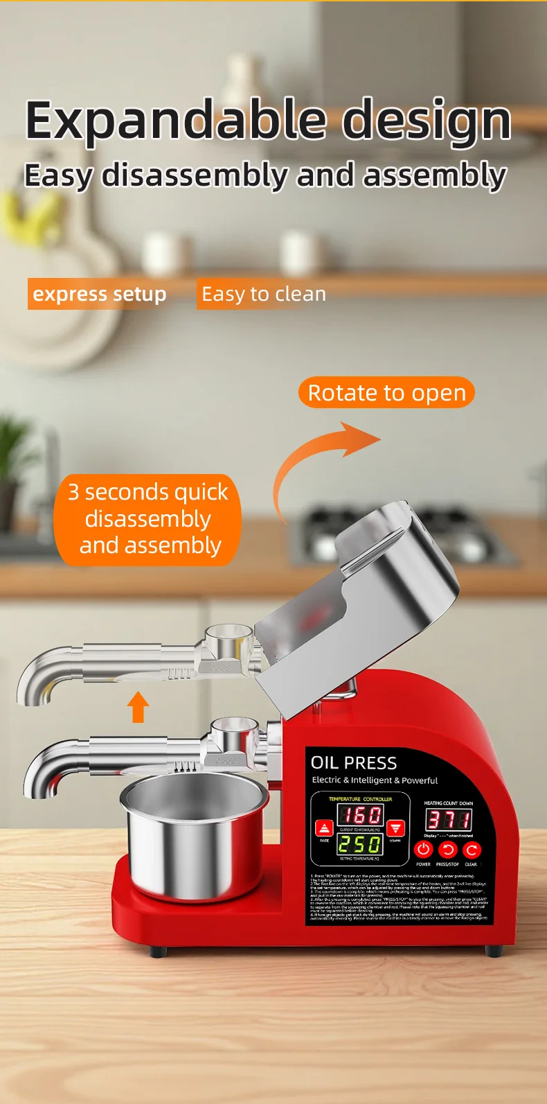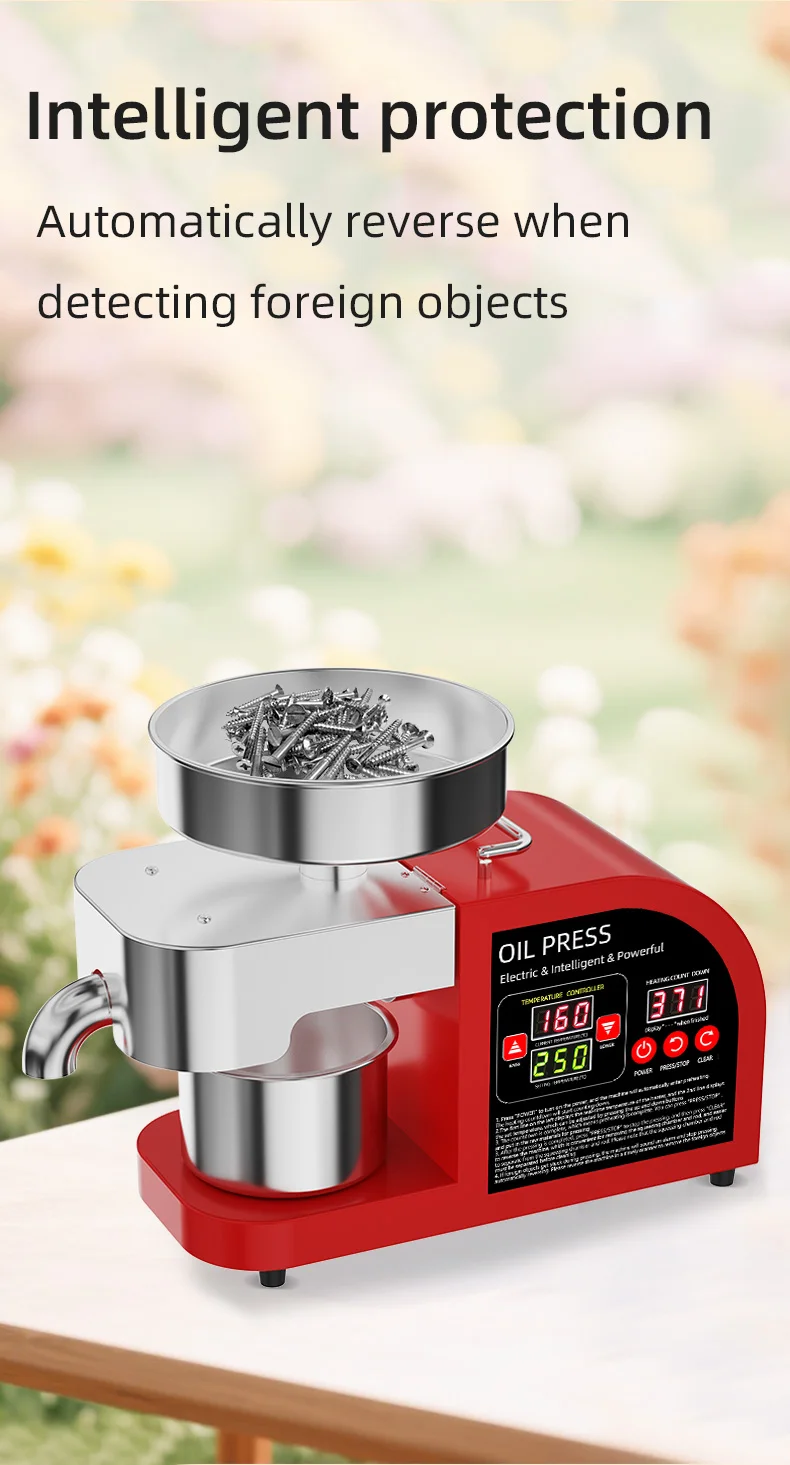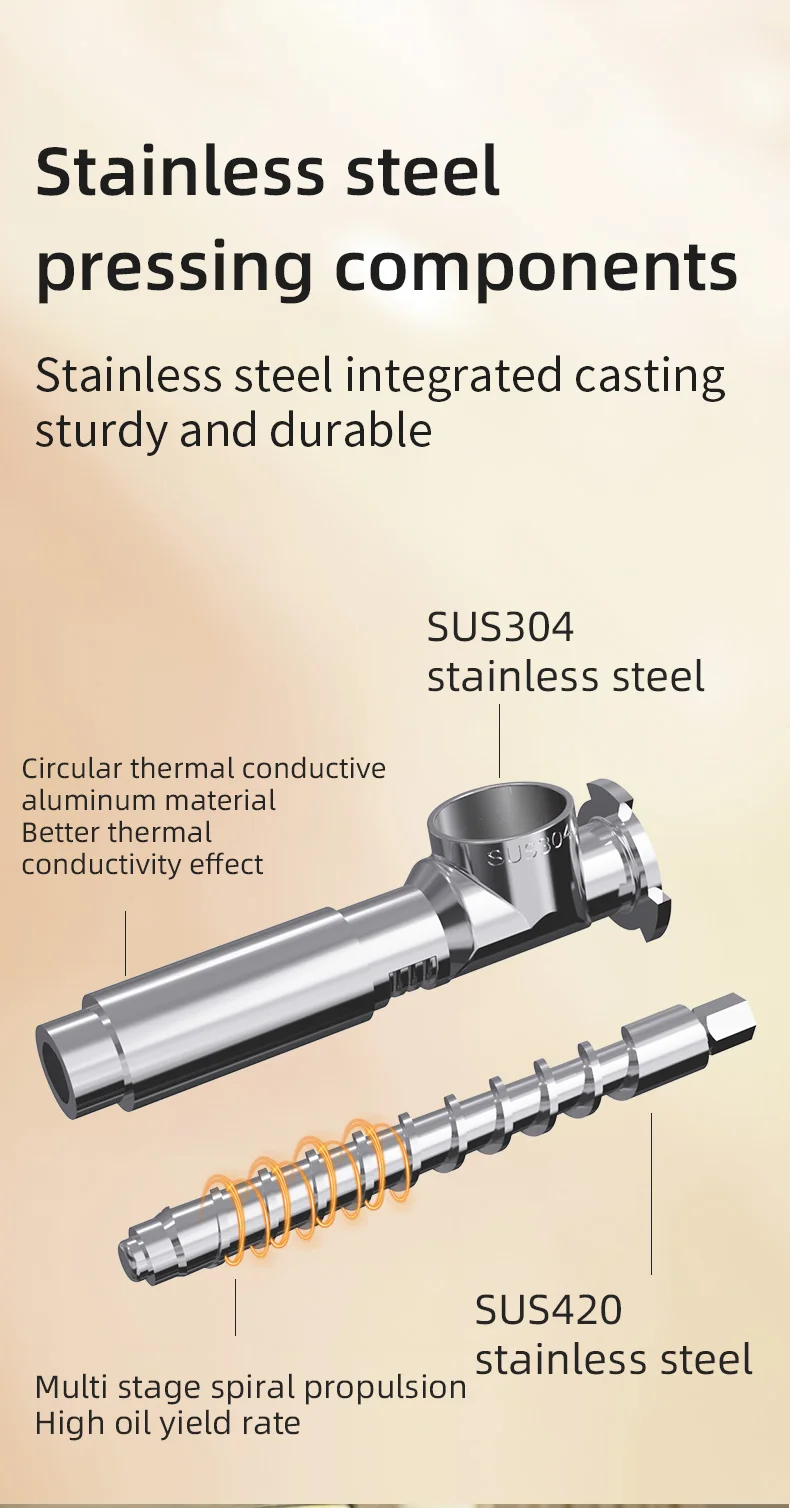 Therefore, the hot-pressing mode is generally suitable for pressing low-value edible oils such as rapeseed and peanuts, with the pursuit of oil yield and the aroma of stir-fried dishes. Cold pressing mode is generally suitable for pressing high-nutrition complementary food oils such as walnut oil, flaxseed oil, almond oil and olive oil, ensuring that nutrients are not lost.