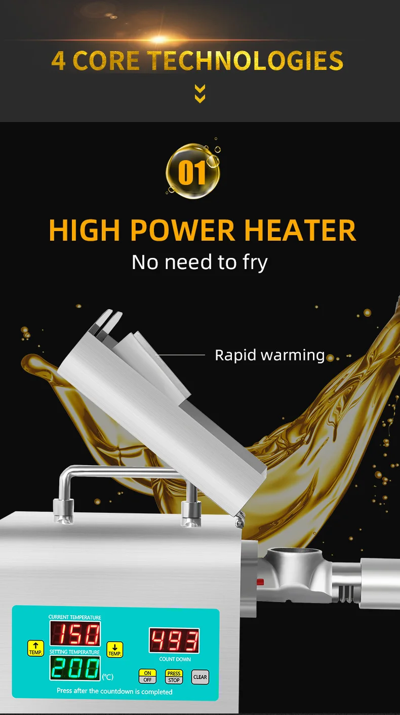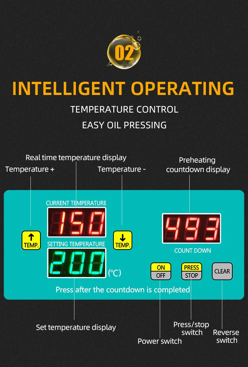 If your oil press has pressing problems, it is very likely that 90% of them are caused by temperature issues. If the pressing chamber is not preheated and the pressing is carried out directly, the raw materials will not be exposed to high temperatures in the pressing chamber and thus cannot achieve oil and residue separation. Therefore, what comes out directly is paste. All oil presses must be preheated for 8 to 10 minutes, and the S series models (large commercial) need to be preheated for 15 minutes. If it is a 110V voltage area, the preheating time should be doubled. Moreover, the pressing chamber and pressing rod should be installed, and the front cover should be lowered to ensure that the heater is in close contact with the pressing chamber.